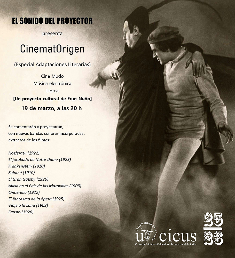 El Sonido del Proyector, un proyecto cultural de Fran Nuño donde se unen cine mudo, música electrónica y libros, presenta el acto CinematOrigen (Especial adaptaciones literarias), en el que se realizará un recorrido por distintas obras clásicas de la literatura que fueron llevadas a la gran pantalla en los orígenes del cine. Las proyecciones de extractos de dichas películas estarán acompañadas de su correspondiente presentación y de nuevas bandas sonoras creadas con música electrónica por el propio Nuño, además de recomendaciones de libros relacionados con los filmes seleccionados.