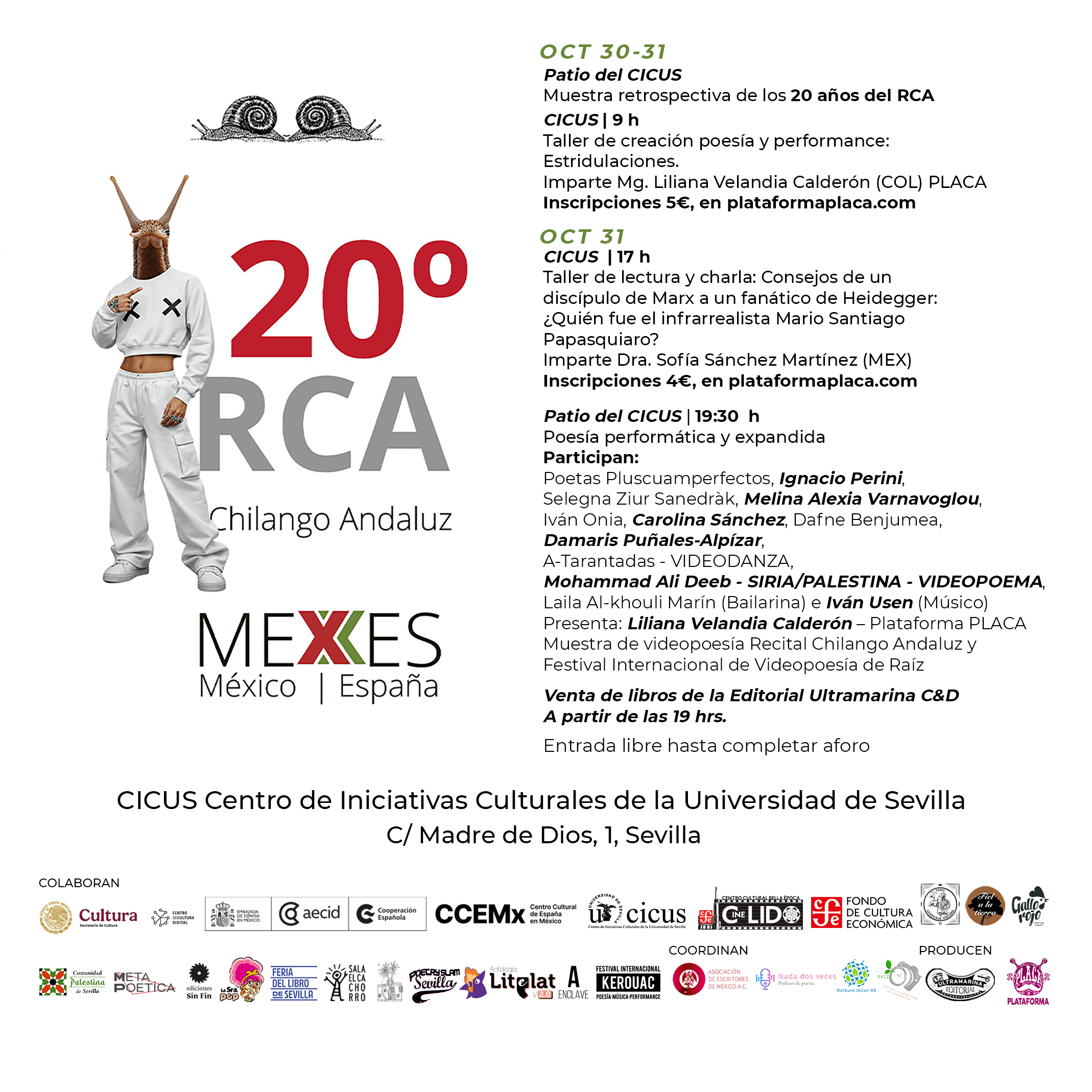 En el presente 2025 se celebra la vigésima edición del Recital Chilango-Andaluz, conmemorando así dos décadas de trabajo poético, colaborativo y transfronterizo; un evento nacido en 2006 en Sevilla a través de la Plataforma de Artistas Chilango-Andaluces (PLACA), con vocación de generar un espacio independiente para el encuentro y la difusión de la poesía contemporánea iberoamericana. Con esta nueva edición, ya son veinte las celebradas en ciudades de México y España, consolidándose como uno de los festivales de poesía más longevos y singulares del ámbito hispanohablante.