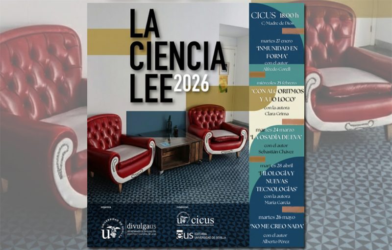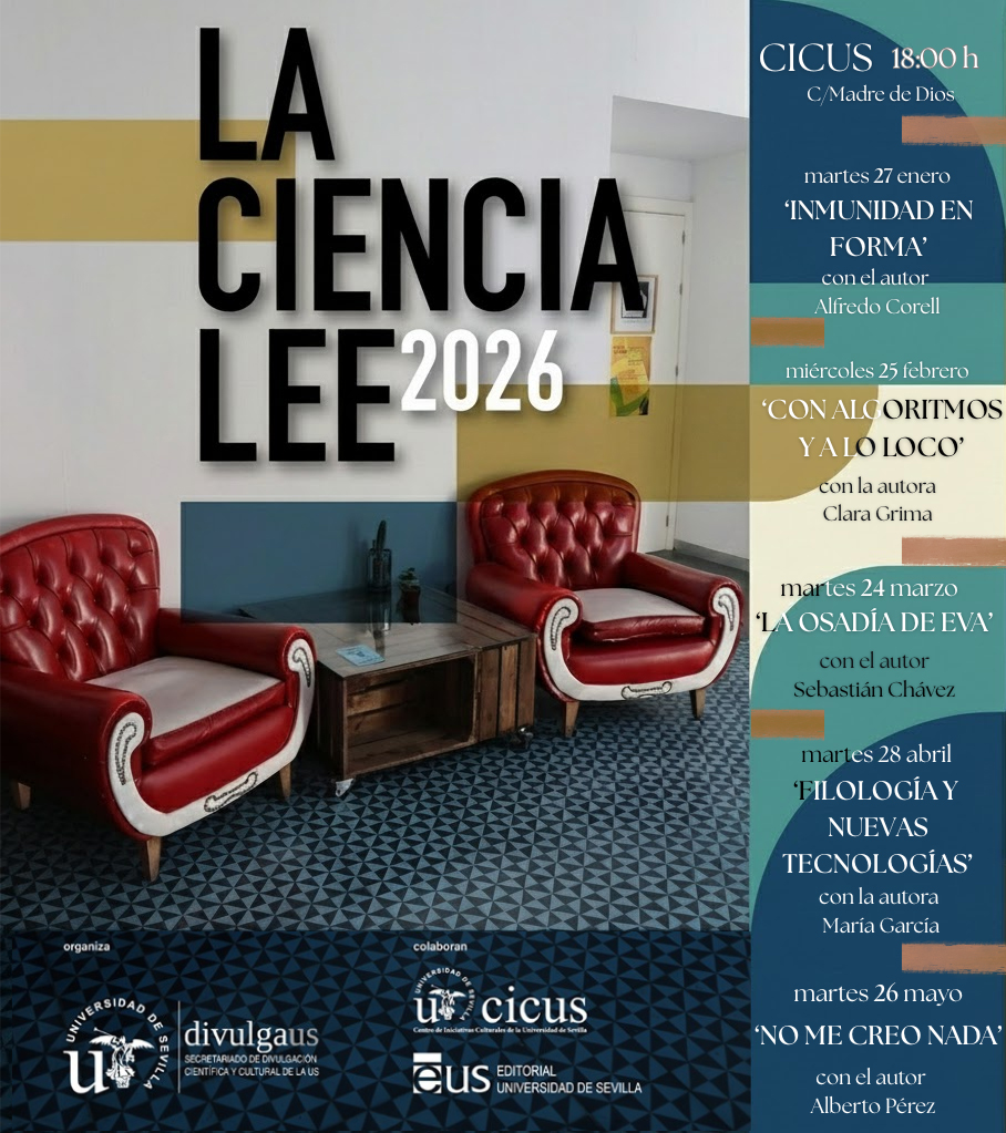 De enero a mayo de 2026 se celebra un nuevo ciclo de encuentros donde la literatura y la ciencia se dan la mano. ‘La ciencia lee’ abre sus páginas a todo el mundo, con una propuesta de obras y temáticas variadas en la que los autores y los lectores compartirán un buen rato de conversación y de debate acompañado de un café. Estas meriendas científico-literarias se celebran los últimos martes del mes en horario de 18 a 19 horas en el Centro de Iniciativas Culturales de la Universidad de Sevilla (CICUS) con reserva previa (20 plazas por encuentro).