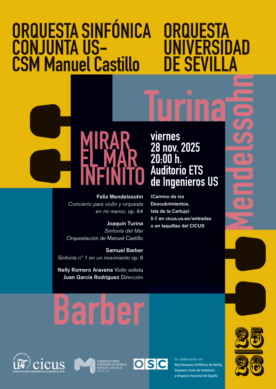 La Orquesta Universidad de Sevilla inicia la temporada 2025-2026 con un programa que redescubre la Sinfonía del Mar, de Joaquín Turina. cuya creación inició en 1945. La obra quedó incompleta, y Turina solamente pudo completar los dos primeros movimientos en su versión para piano antes de su muerte en 1949. En 1982 el compositor Manuel Castillo instrumentó esta obra con motivo del centenario del nacimiento de Turina. La OSC estrena esta instrumentación en Sevilla, que solamente se ha tocado una vez en su estreno por la Orquesta Nacional de España. El programa se completa con el concierto para violín y orquesta de F. Mendelssohn y la Sinfonía nº1 de S. Barber. El concierto será dirigido por Juan García Rodríguez, director titular de la agrupación
