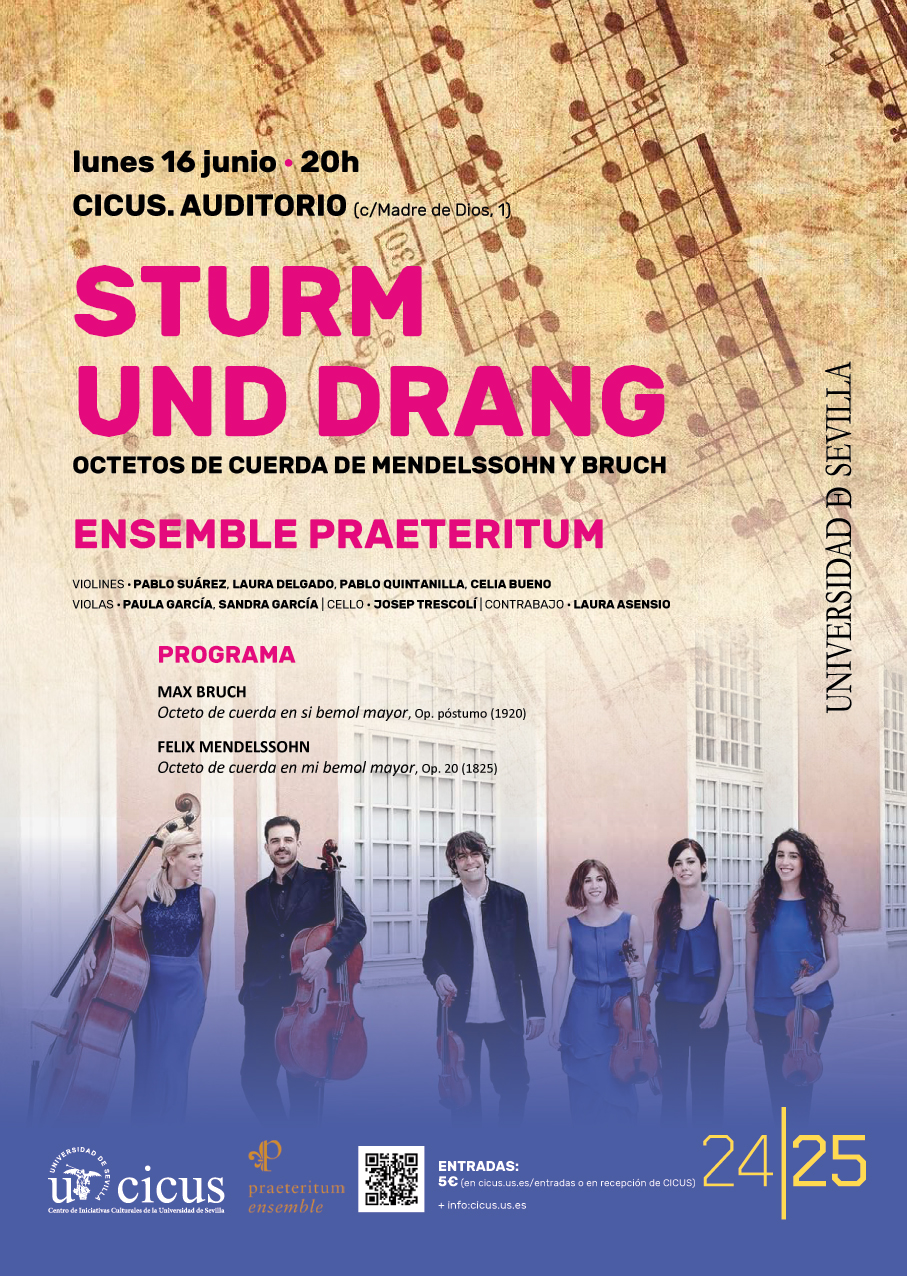 Ensemble Praeteritum es sin duda una de las formaciones musicales de referencia en el panorama nacional, contando con memorables actuaciones a lo largo y ancho de la península, así como en otros escenarios europeos. En esta ocasión se presenta en formación de octeto en CICUS con el programa escogido bajo el nombre de Sturm und Drang, interpretando dos obras ineludibles de la Historia de la Música, creaciones de los compositores alemanes Felix Mendelssohn (1809-1847) y Max Bruch (1838-1920).